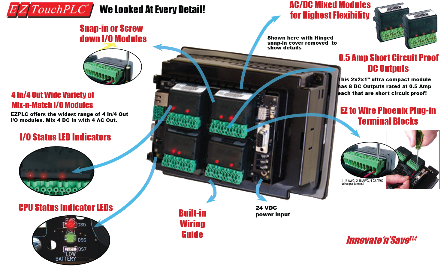 Whereas there are other integrated HMI and PLC products from some other suppliers, there is none like EZ3 TouchPLC, EZ3 Jr. TouchPLC, EZ7 TouchPLC, that have the incredibly powerful and wide selection of world class plug-in I/O modules, 35 in total.