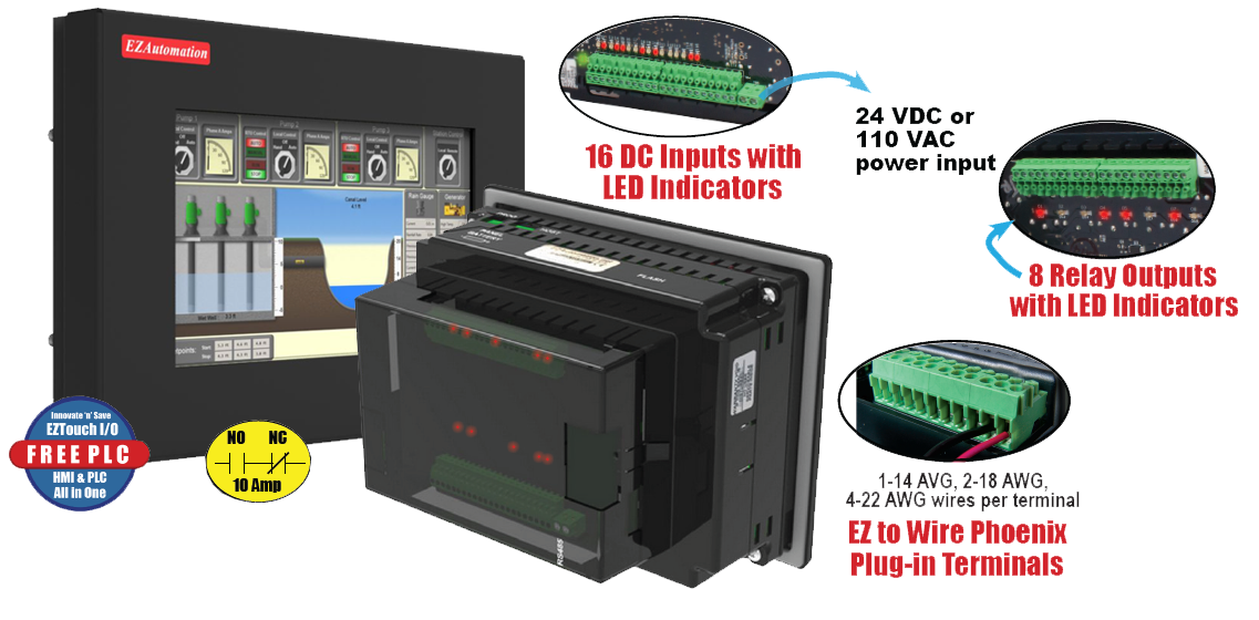 Only HMI w. Detachable Hot-swappable HMI and 24 Fixed PLC I/O in 6”, 7”, 8”, 10”, 15” Displays. 16 DC inputs and 8 Relay outputs NO/NC 10 A with built-in snubbers.