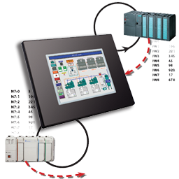 • Dual PLC Drivers with automatic tag conversion. All EZ3 and EZ7 HMIs have the capability to simultaneously talk to two PLC networks. For example, Ethernet I/P on one side and Modbus RTU on the other side communicating to a motor drive. Tags are automatically converted. This allows the two networks to communicate to each other through EZTouch.
