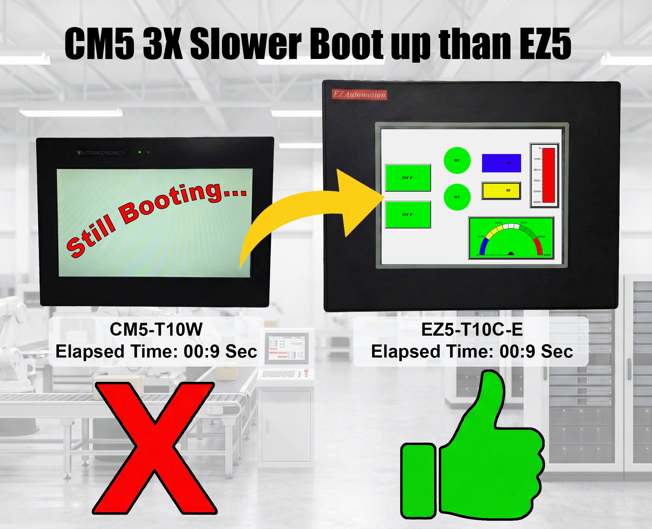 • CM5 is not an appropriate drop-in replacement and is really made in China and transshipped to Japan. It's boot up time is 3x slower than EA9 or EZ5 and many customer complain about its limited memory. • When comparing identical screen sizes for example CM5 12” which is the same as EZ5 10”, CM5 is currently 28.8% higher in price than EZ5 and when 15% tariffs hit it will be 48% higher than EZ5. • CM5: No direct replacement available for 8” and 15” EA9 models. For 10” replacement of EA9, CM5 is actually 8”, For 12” replacement of EA9, CM5 is actually 10”. Screens have to be redesigned as CM5 has a different aspect ratio. Also, EA9 programs written before May 9, 2022 (Firmware 6.72 or earlier) cannot be converted to CM5