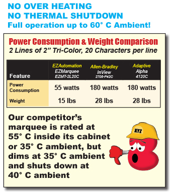 4. It has a patented design with 1/3rd the weight, 1/3rd the power and 1/3rd the cost as compared to Rockwell or Spectrum that limit their marquees to 35 degree C ambient, which automatically shut down when the temperature inside the marquee cabinet rises above 55 degree C. Temperature inside the cabinet can easily rise 20 degrees because normal LEDS generate a lot of heat except our LEDs. Our marquees are rated at 60 degree C ambient.